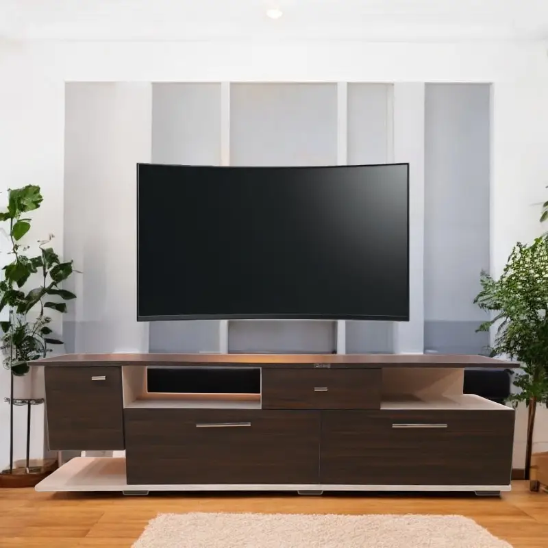 ترابيزة تليفزيون عصرية مصنوعة من الخشب البنى والبيج، تتميز بتصميمها الأنيق ووظائفها العملية. تحتوي على رفوف مفتوحة لتخزين أجهزة الصوت والألعاب، مع ثلاثة أبواب ودرج كبير توفر مساحة تخزين كبيرة.