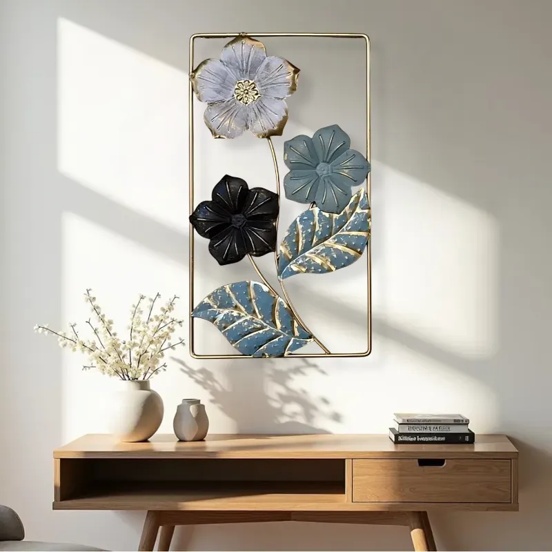 - لوحة حائط معدنية بتصميم عصري ثلاثي الأبعاد يجمع بين الأشكال الهندسية والزخارف النباتية.