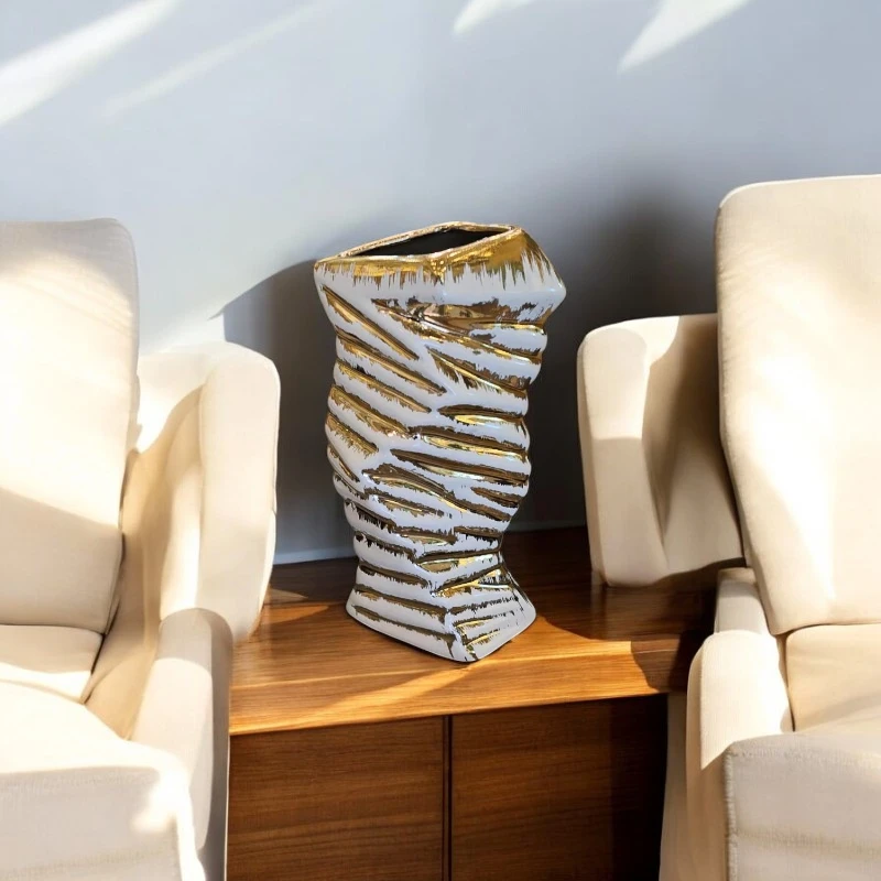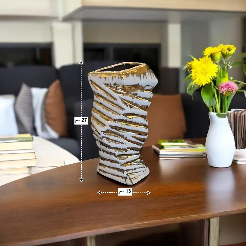 - اللون الأساسي للفازة هو الأبيض، مع لمسات ذهبية على الخطوط العرضية، مما يضيف لمسة من الفخامة والأناقة إلى الفازة.