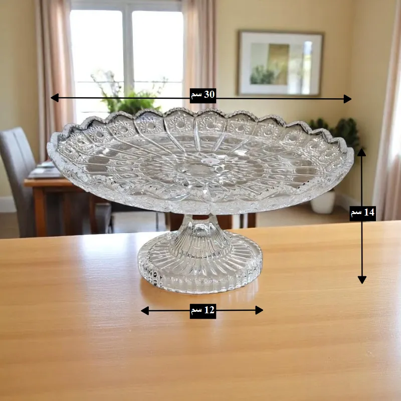 - طبق فاكهة كريستالي شفاف ذو تصميم بوهيمي مميز، يتميز بقاعدة مرتفعة مزخرفة تضفي عليه فخامة ورونقًا.
