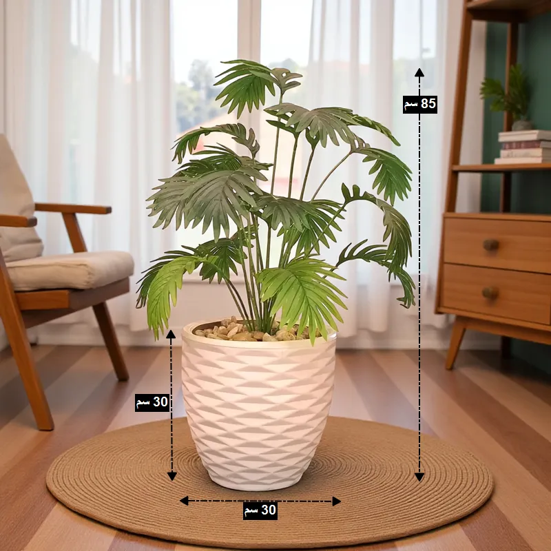 - الأبعاد: الارتفاع الإجمالي يبلغ 85 سم، بينما يتميز الإناء بقاعدة مستقرة يبلغ قطرها 30 سم وارتفاع 30 سم.