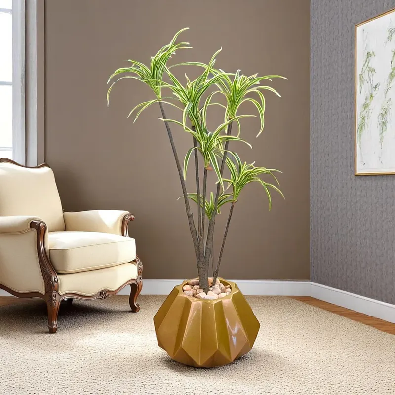 شجرة دراسينا صناعية خضراء وبيضاء في وعاء ذهبي هندسي، مثالية لديكور المنزل الداخلي العصري.