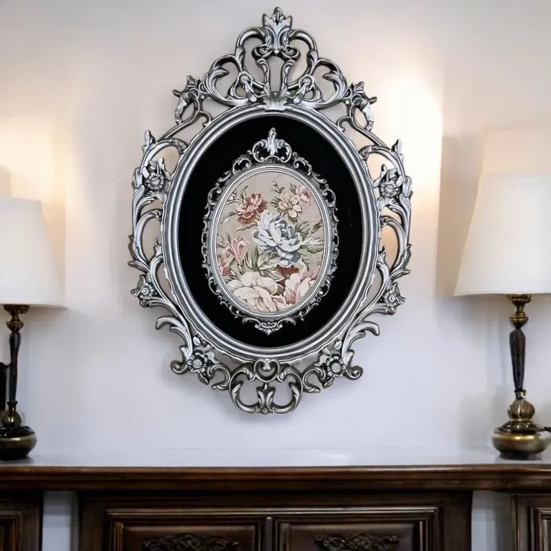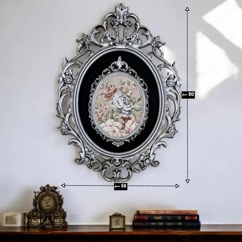 - لوحة حائط جوبلان، بتصميم كلاسيكي مع إطار مزخرف باللون الفضي مما يضيف لمسة من الفخامة والأناقة إلى أي غرفة.