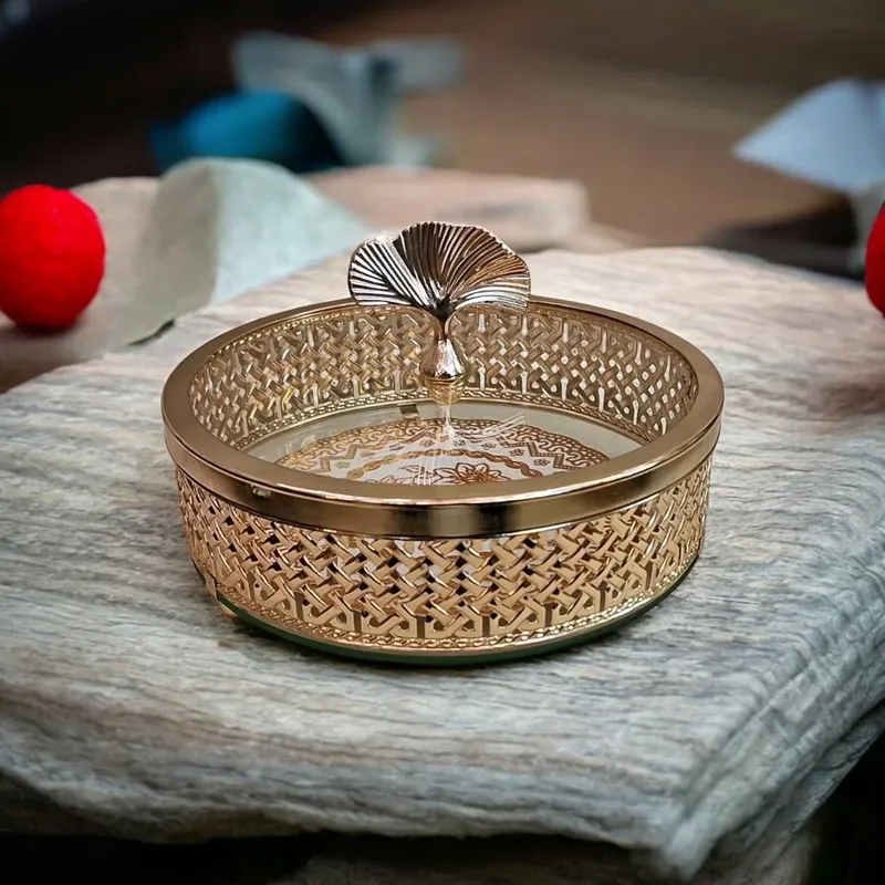 - الغطاء الزجاجي يتميز بمقبض معدني ذهبي على شكل ورقة الشجر.