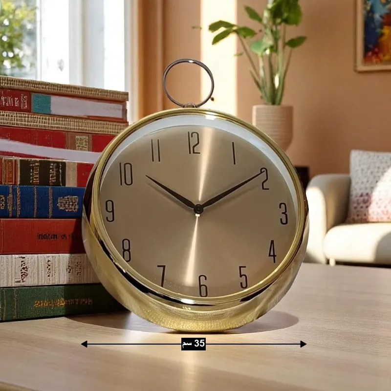 ساعة حائط ذهبية دائرية أنيقة، قطر 35 سم، بحلقة تعليق، موديل 029103