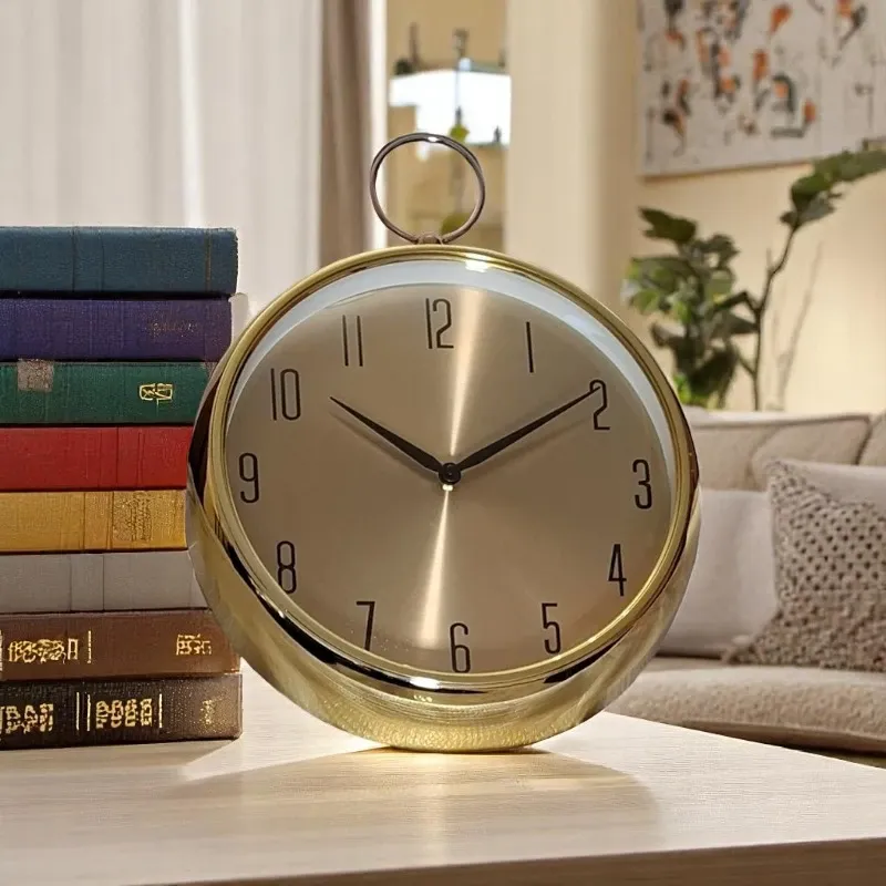 ساعة حائط ذهبية بتصميم فريد، بحلقة تعليق، ديكور منزلي فاخر.