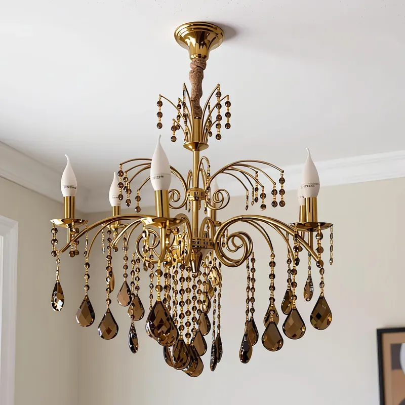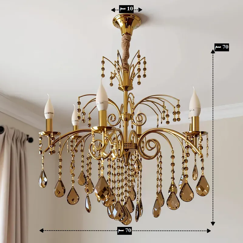 - كريستال عصفور أصلي: تأتي النجفة مرصعة بدلايات وسلاسل من كريستال عصفور بلون عسلي (Honey/Champagne)، مما يضفي جواً من الرقي والهدوء على الغرفة عكس الكريستال الشفاف التقليدي.