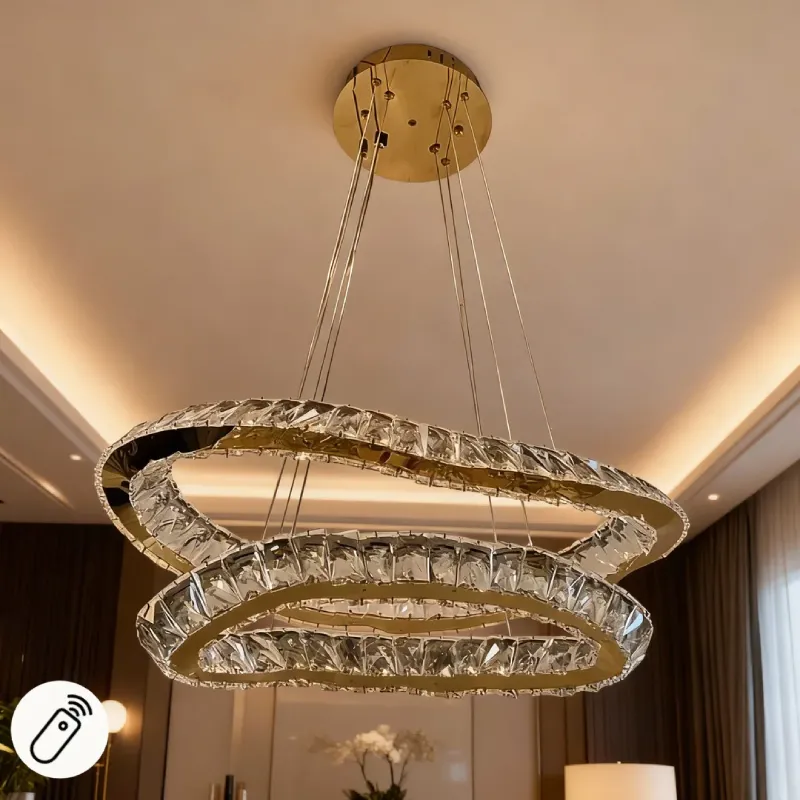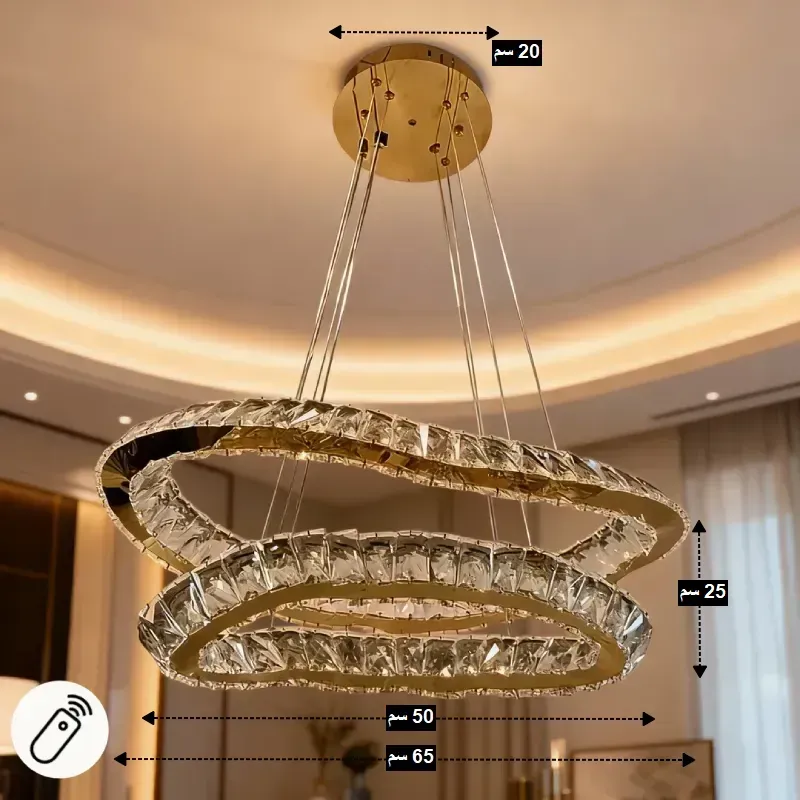 - ارفع مستوى أناقة ديكور منزلك مع نجفة الليد الكريستالية المزدوجة، المصممة خصيصًا لتكون القطعة المركزية المضيئة في أي غرفة. يجمع هذا التصميم المودرن بين الإطار الذهبي اللامع وأجود أنواع الكريستال الشفاف، مما يخلق تلاعبًا ضوئيًا ساحرًا ينعكس على الغرفة ويضيف عمقًا وبريقًا لا مثيل له.