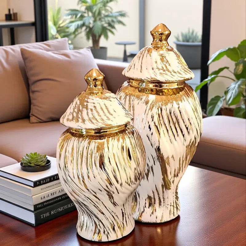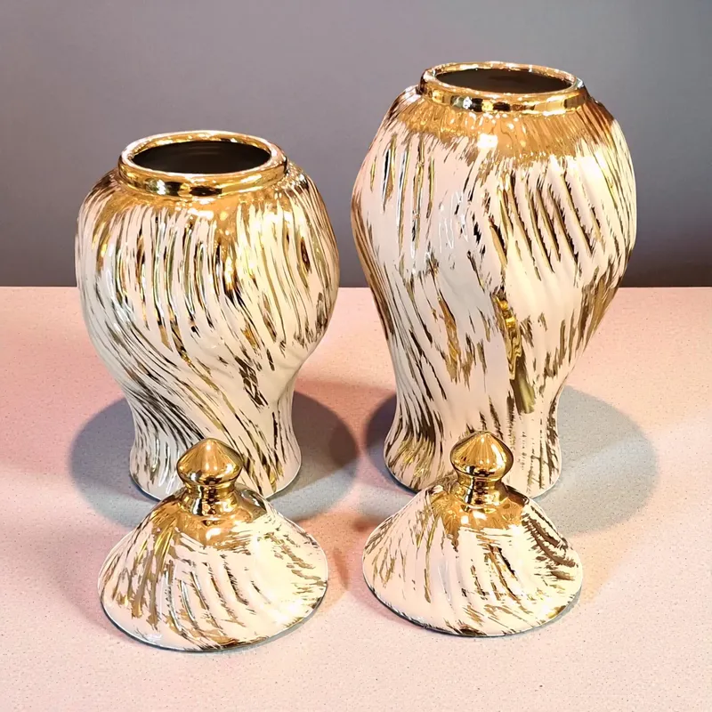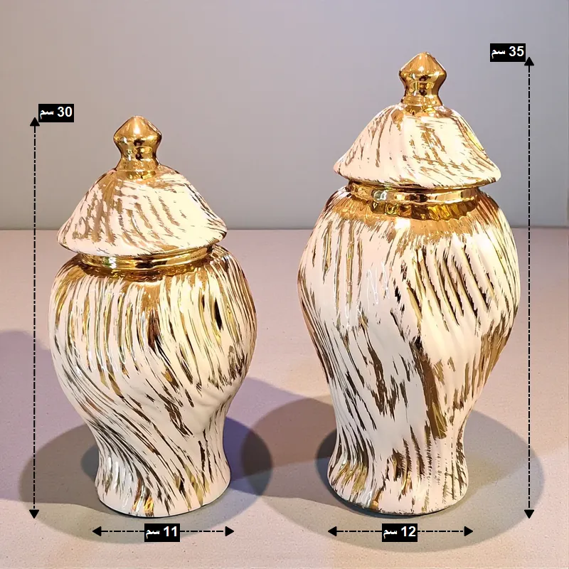 طقم فازات زنجبيل سيراميك بغطاء فاخر | تصميم ملكي ذهبي وأبيض عصري، موديل 030427